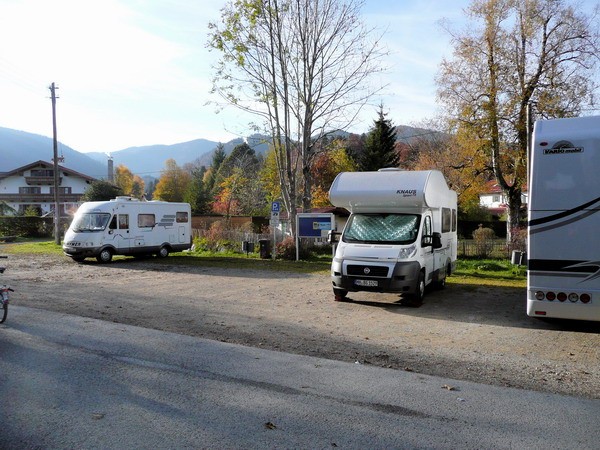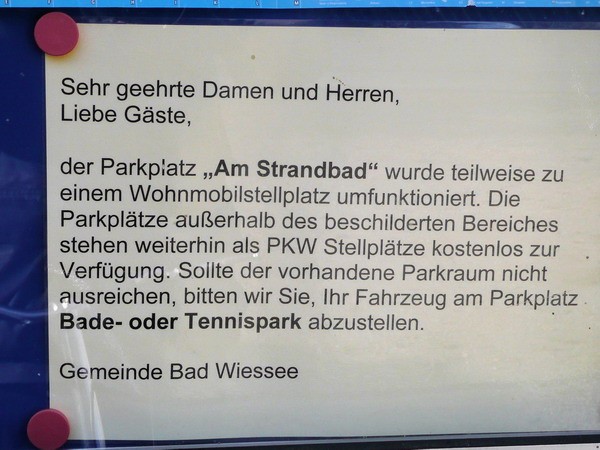 Neuer und ganz offizieller SP des Städtchens Bad Wiesse am Tegernsee. Dazu wurde ein Parkplatz am Strandbad "umgewidmet" zum Womo-Stellplatz.