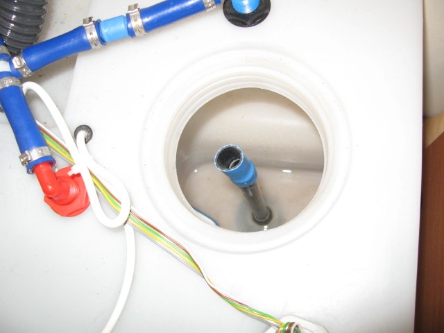 Von oben in den Tank fotografiert sieht man das graue Überlaufrohr, das mit einem Gewinde im Tankboden verschraubt ist und zum Entleeren des Tanks herhausgedreht werden kann/muß. Das obere blaue Ende ist die Verlängerung, die jetzt bis knapp unter den Schraubdeckel reicht. So einfach geht's :razz: Otone