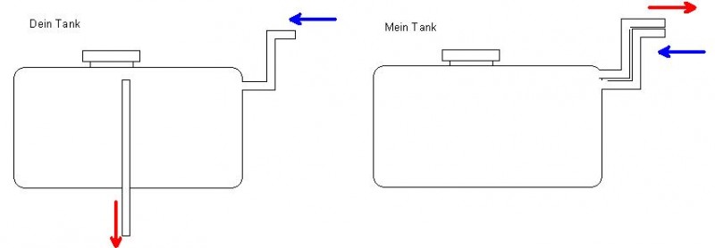 @otone & andere: Scheinbar hatte ich dich, bzw die Ausgestaltung deines Tanks missverstanden. Wenn der Überlauf im Tank selbst, frei zur Atmosphäre geht, kann natürlich nichts passieren. Anders wenn der Überlauf ohnehin schon über Tankniveau liegt und noch zusätzlich verlängert wird. Welche Kräft dann zb auf den Reinigungsdeckel wirken, sollte der Link veranschaulichen. Hier zum Vergleich die beiden Bauformen: blau= Befüllung, rot=Entlüftung/Überlauf ![]() Schade, jetzt sind wir mal wieder beim Thema.
