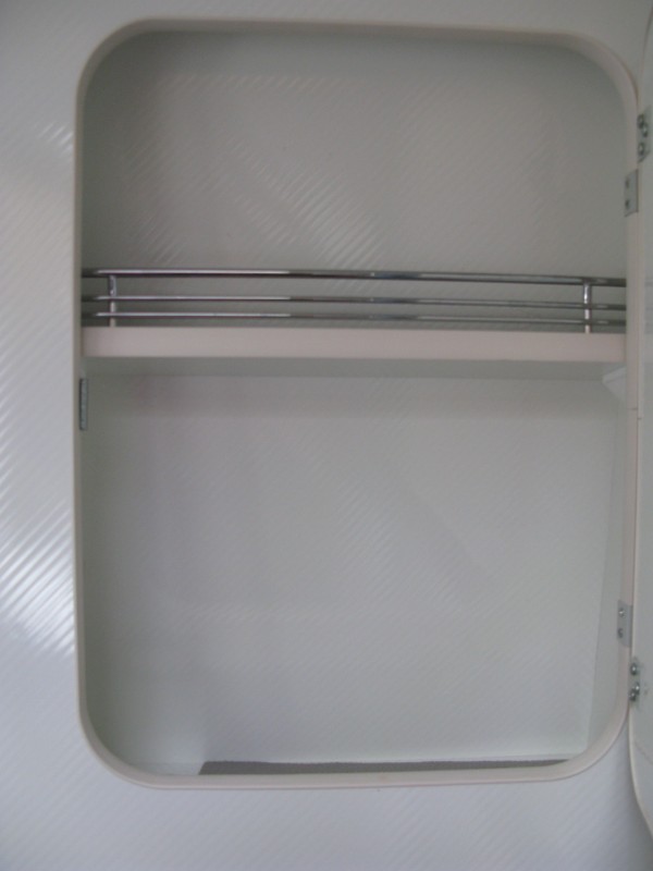 Dieser Schrank wurde entsorgt, das Nötigste steht auf einem Bord wie zuhause und das Sonstige ist in einer Seitentaschenablage abgelegt.