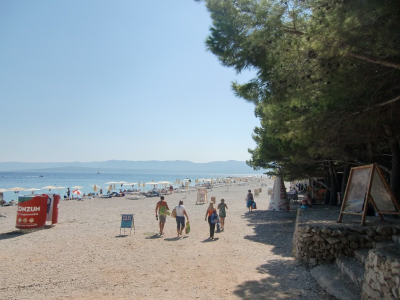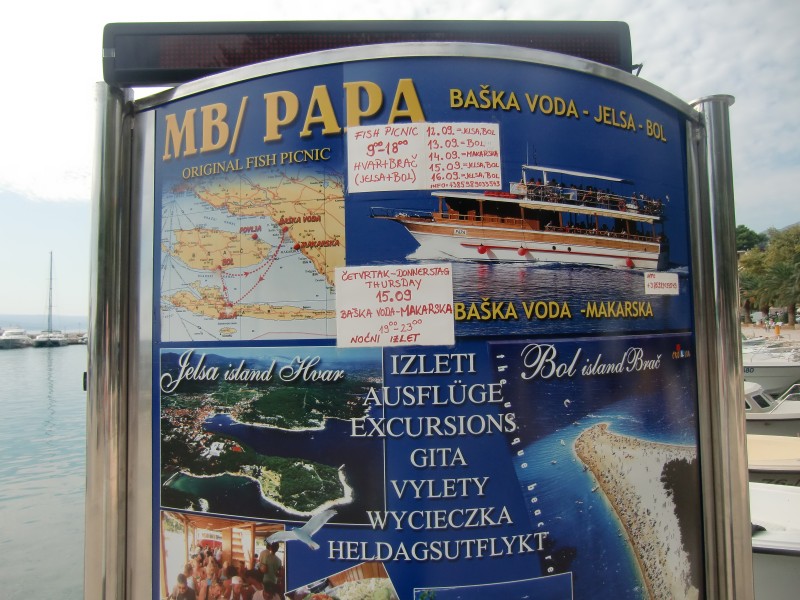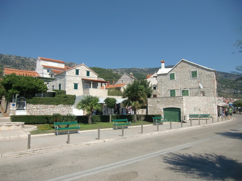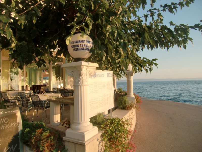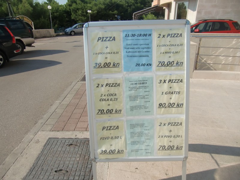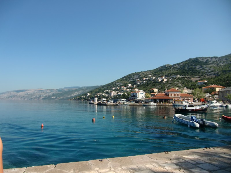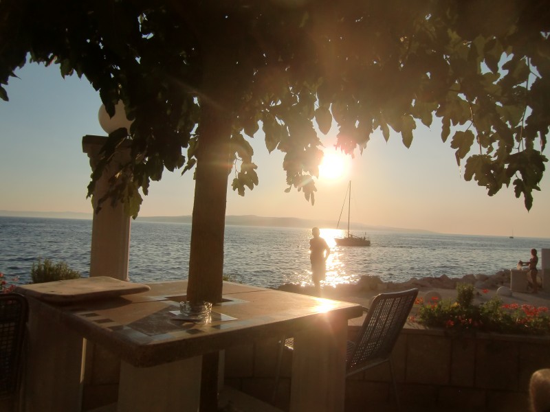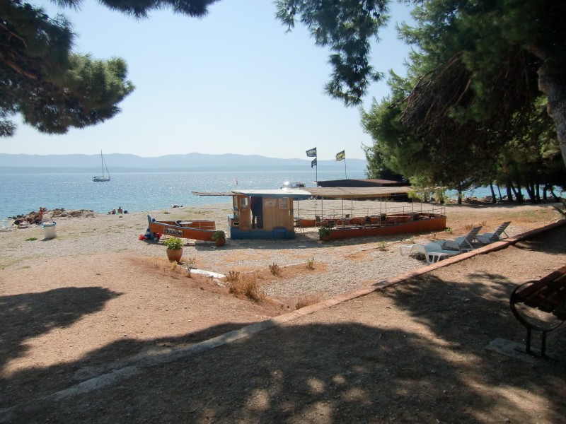 Ganz am Ende beim Bootsanleger ist eine urige Gaststätte, dort setzen wir uns hin mit Blick aufs Wasser und zur Sonne. als Beispiel gehen die Bäume durch die Tische .auf dem Schild steht 0,5 Liter Karlovacko für 12 Kuna, das sind 1,60 € das haben wir uns gegönnt. wir träumen auch von unseren Bootsausflug ,da wir auch auf Brac blicken, ja das war sehr schön.