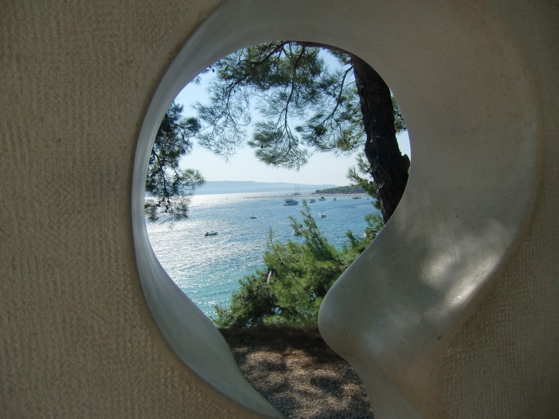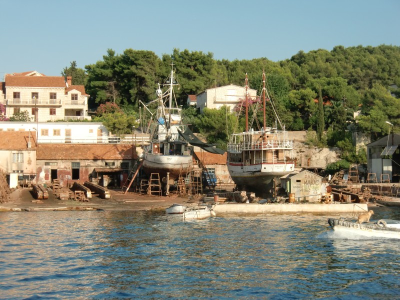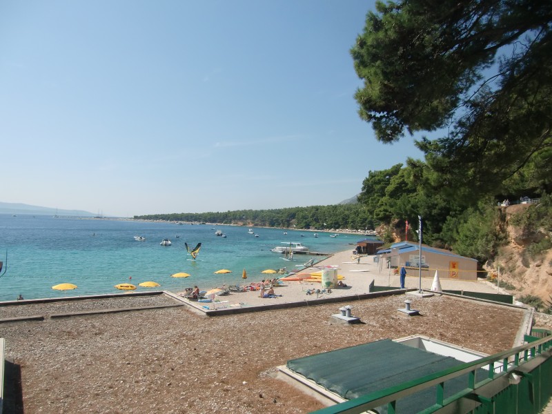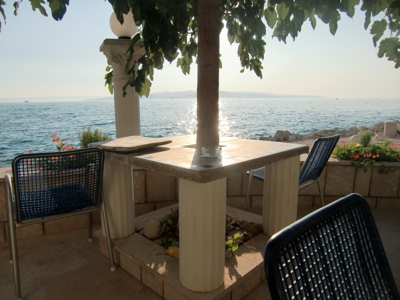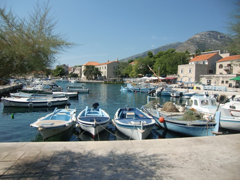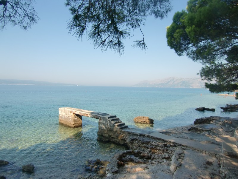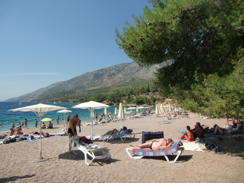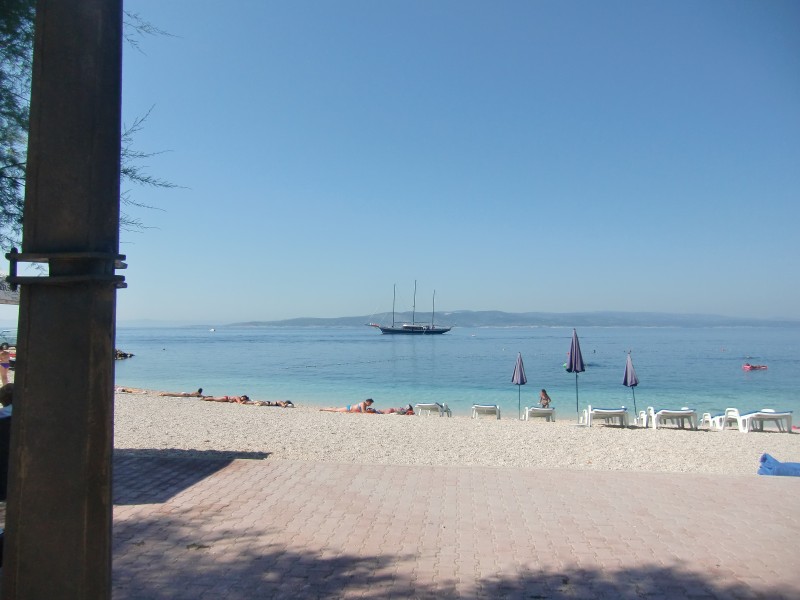 Ganz am Ende beim Bootsanleger ist eine urige Gaststätte, dort setzen wir uns hin mit Blick aufs Wasser und zur Sonne. als Beispiel gehen die Bäume durch die Tische .auf dem Schild steht 0,5 Liter Karlovacko für 12 Kuna, das sind 1,60 € das haben wir uns gegönnt. wir träumen auch von unseren Bootsausflug ,da wir auch auf Brac blicken, ja das war sehr schön.