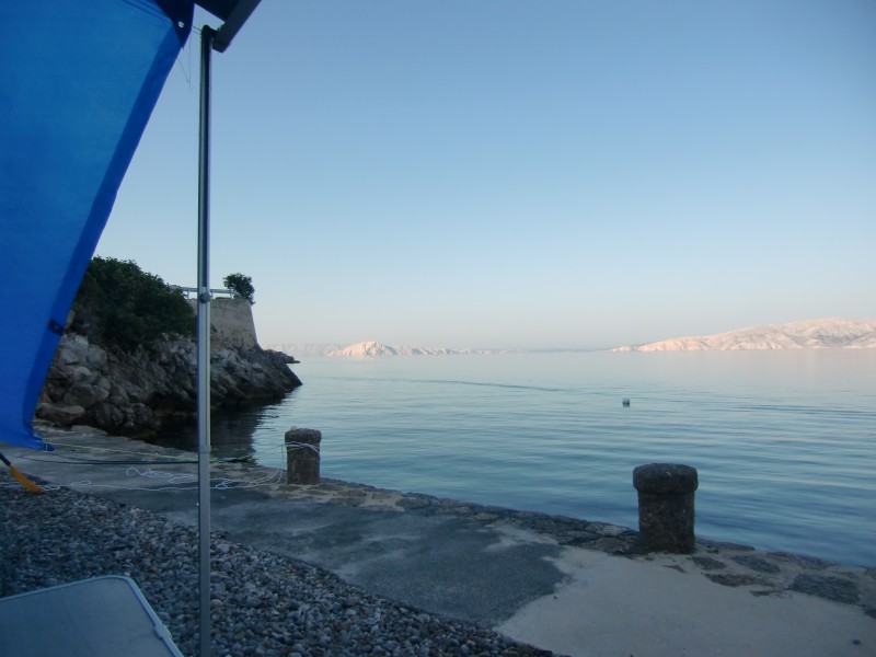 07.00 Uhr sind wir wach, na klar die Aufregung treibt uns hoch. Um 08.00 Uhr das Frühstück am Wasser .Ich bin vor, zum bezahlen, Achtung 272 Kuna, das sind keine 13,00€ für 1 Nacht 2Pers.ohne Strom. Super um 09.00 Uhr sind wir vom Camp weg Richtung Senj,