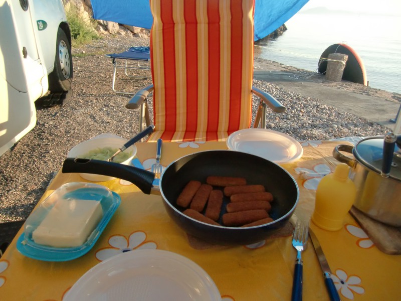 wir sind um 08.30 Uhr wach, Ute geht es noch nicht so gut (zu viel Sonne gestern)Frühstück, Der Kaffee ist fertig es gibt lecker frisches Weißbrot mit Schlagwurst, dazu für mich natürlich kalten Kakao.