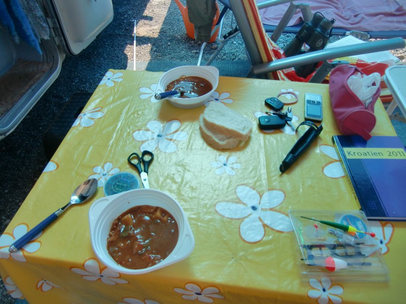 obwohl überall Platz wäre na ja es gibt halt solche und SOLCHE !!! er nimmt uns die sicht auf Sv.Juraj ja die totale Idylle ist im Arsc… !!!! Aber wir stellen uns wieder an unseren Platz, obwohl ich eine Leine gespannt hatte .trotzdem lassen wir uns es nicht vermiesen. Markise raus Sichtschutz ran und ab in die Fluten. Das Wasser hat sage und schreibe 25°C sonst war das noch nie so warm hier Jetzt habe ich Ute die Liege hin gestellt zum Sonnen .wie sich später heraus stellte war das nicht so gut. ich bleibe im Schatten und schreibe das alles auf sonst vergesse ich das, bin schließlich über 50 jetzt mache ich die Angeln scharf, aber vorher noch mal in die Adria hüpfen ,da es so unglaublich heiß ist. Das war eine kurze Abkühlung. ich spanne noch eine Plane da die Sonne sehr aufdringlich ist.(zum merken, Sonnensegel kaufen)Ute macht jetzt essen ,denn es ist schon 18.00 Uhr heute gibt es die Fischstäbchen mit Kartoffelbrei und kühlen Wein dazu jetzt wird geangelt