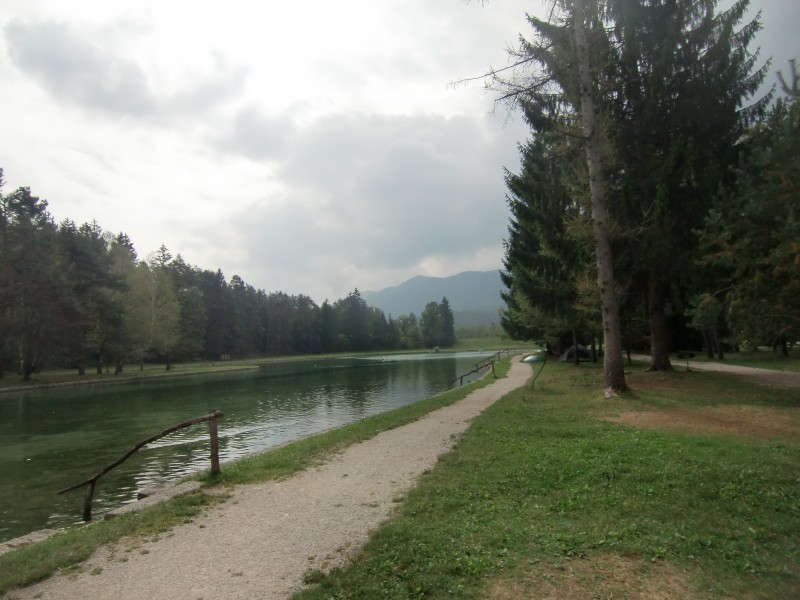 er ist von Fluss „SAVA“ ein gefasst und in der Mitte ist See. Seit 12,00 Uhr laufen wir schon über den platz um 13,00 Uhr entscheide ich einfach, uns an den See zu stellen, aus dem Einfachengrund , Von hier aus sieht man die Berge. Es ist schön hier, die Sonne scheint.