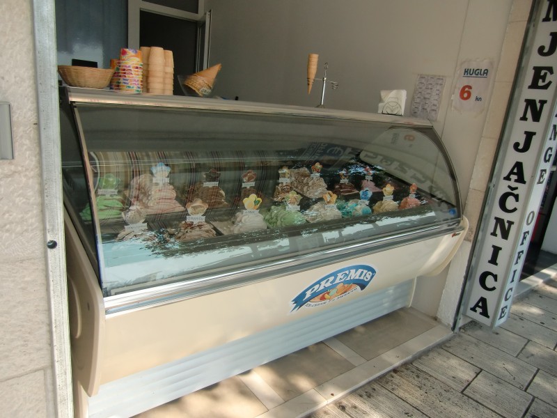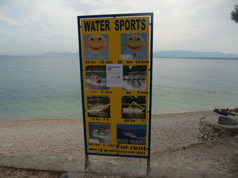 falle sofort in die Fluten. Ute liegt in der Sonne nun aber gebe ich Ute die Lumi und sie paddelt ziemlich weit raus so weit war sie noch nie draußen, man darf nie Angst mit Mut verwechseln. Gegen 15,00 Uhr suchen wir wieder unsere Gaststätte auf um Cevapcici und kaltes Bier sowie ein Glass Wein zu bestellen. wir sind wieder einmal satt für 50 Kuna(ca.7 €) billig aber leckernatürlich noch die Beine vertreten und Ute eis holen .man könnte denken, Ey wie Öde, aber wenn es schmeckt und gemütlich ist dann schon .Wieder Richtung Camp laufen wir einfach mal in die andere Richtung, das sind auch ca.2 Km. Dann kommt ein kleiner Ort ganz niedlich, hier gibt ein Bankomat, sowie7 Gaststätten und ein Konzum.