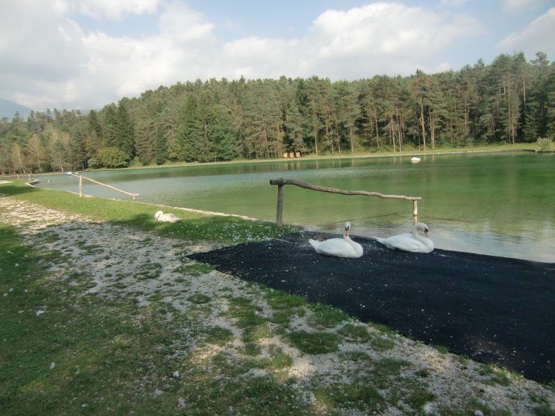 leider geht es mir immer noch nicht gut, nehme wie immer Tablette und lege mich hin. Ute möchte gerne nach dieses Bled laufen laut der Rezeption ca,3 Km, aber nach 1h im Wald dreht sie um und ist wieder hier. vor uns sitzt eine Schwanen Familie mit 2 jungen, die kriegen jetzt kroatisches Weißbrot .