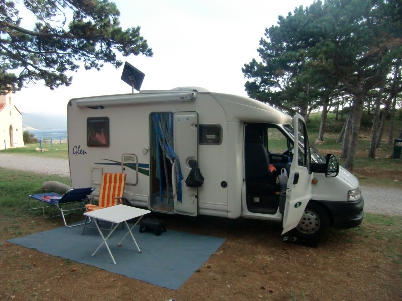 Ute schicke ich zum strand die Sonne noch aus nutzen natürlich mit unserem Badethermometer, ich lege mich etwas hin, mir geht’s immer noch nicht gut. vorher habe ich mit dieser sch… B60 Antenne versucht Astra zu erhaschen, vergebens.14.00 Uhr kommt Ute vom Sonnen baden sie ist nicht im Wasser gewesen, weil die Adria sich auf 12°C total abgekühlt hat , obwohl Lufttemperatur 29°C sind. Wo ich jetzt sitze kann ich auf unser Senj schauen und sehe dabei nur noch dunkle Wolken. Wir dösen so vor uns hin ich futtere wieder Tablette, Ute geht kurz noch mal zum Strand. Wir laufen noch mal vor zum Hafen aber auch hier haben die Gaststätten schon zu , schade. Ein kleiner Konzum hat noch auf, da braucht der kranke noch Bier für die Heimfahrt, Ute ist sauer wollte doch die letzten Kuna noch beim essen ausgeben. Jetzt bitte ich Ute ,die alte Campingschüssel raus zu holen ,die habe ich immer bei ein kleines Stativ und 20 m Antennenkabel, nach ca. 3 Minuten hatten wir Empfang. Die ist einfach besser nur 36 cm Durchmesser, aber überall Empfang. Ich bin trotzdem froh schon hier zu sein es hat sich total zu gezogen und windet wie sau. Wir haben für morgen uns einen neuen plan aus gedacht., aber der wird sich auch noch ändern. Geplant ist erst einmal KRK, na mal sehen. Erst einmal macht Ute lecker Bratkartoffeln mit Hühnerfrikassee wir können leider nur drinnen essen draußen ist es zu Stürmisch. Es wird immer windiger lieber alle Fächer wieder ausräumen. ,Fenster alle kontrollieren, nur die kleine Schüssel hält tapfer durch und überträgt uns Fernsehbilder. in der Nacht war ich bestimmt 10x draußen, ob alles o.k. ist, vielleicht habe ich seit dem Drama in Griechenland eine kleine Macke