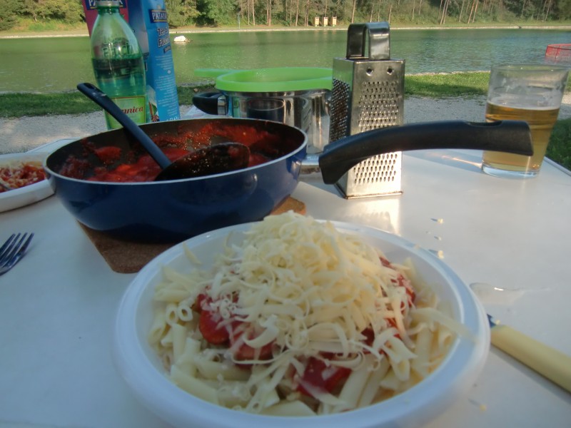 ich habe eine Bitte an Ute, na welche ,super ihr seid alle gut drauf, natürlich Spaginskis machen mit Wiener und Tomatens .und viel Käse wir sitzen endlich wieder draußen am Wasser schauen auf die Berge und verputzen die Nudeln.