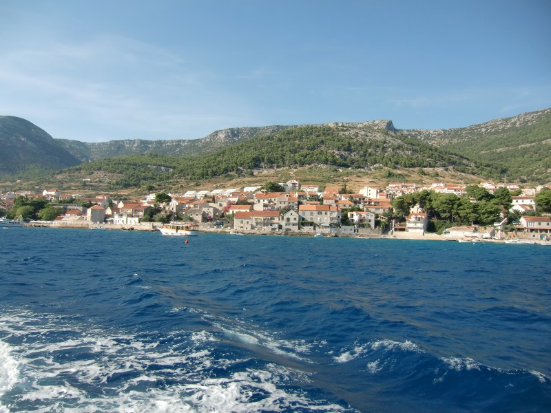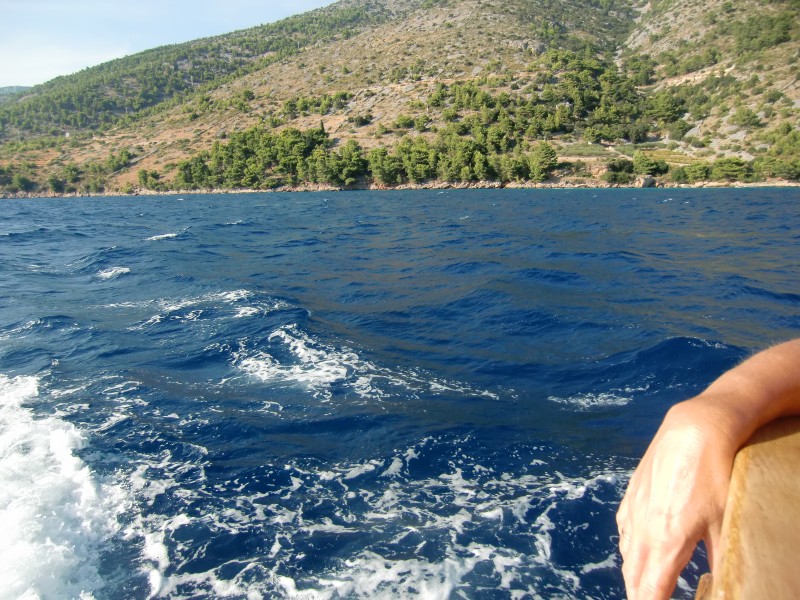 en zu brechen, auf dem Schiff war auf einmal Ruhe. auch mal ganz schön, aber etwas unheimlich. die Adria zeigte sich böse und hatte weiße Wellenspitzen, das ist nicht gut. Aber ich fand der Kapitän hat alles ruhig im Griff. Wir fuhren sehr dicht parallel zur Insel Brac ca. 6,4 Km lang auf unserer Seite ist sie fasst unbewohnt,