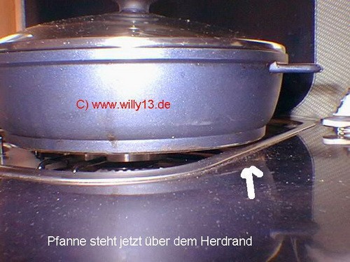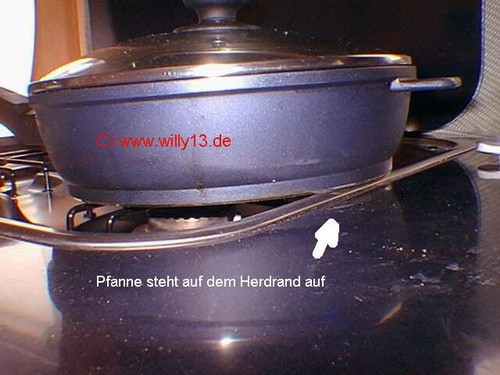 Wem ist schon mal aufgefallen das bei den 3Flamm-Kochfelder eine normale Pfanne nie mitten auf der Flamme steht sondern versetzt nach innen, weil sie sonst am Kochfeldrand aufsteht. Ich habe mich darüber geärgert und mir eine Änderung gebaut die bei Pfannennutzung auf das Kochfeld kommt und die Pfanne anhebt damit diese nicht mehr den Rand berührt