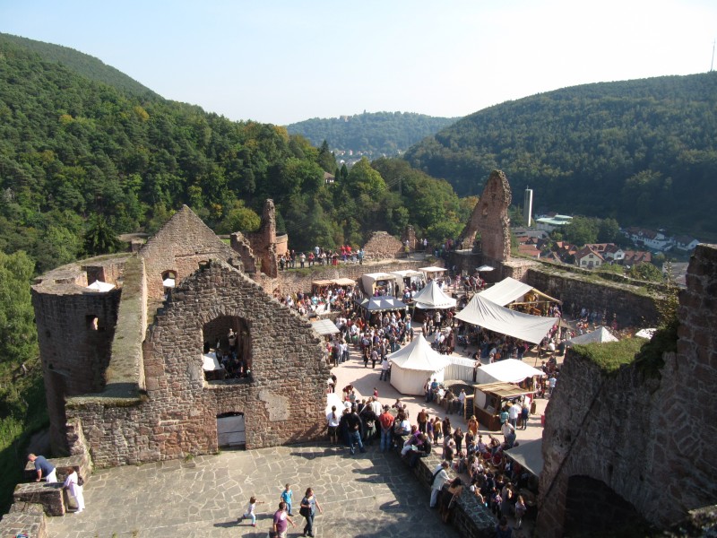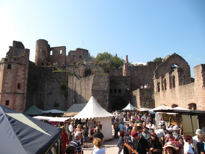 Sonntag 25.09.2011 - in Bad Dürkheim Schon gestern hatten wir beschlossen, noch einen Tag in Bad Dürkheim zu bleiben. Es ist zwar leider kein Wurstmarkt mehr (dann hätten wir mit Sicherheit keinen mehr Stellplatz bekommen), aber auf der Hardenburg ist ein mittelalterliches Burgfest. Nach der obligaten Runde mit Dackel Max gehen wir zu dem vor dem Weinfass gelegenen Großparkplatz, von den ein Shuttlebus zur Hardenburg fährt. Das Burgfest ist sehr originell. Durch verschiedenen mittelalterlichen Gewänder, die sehr viel zu sehen waren, und aufgrund der entsprechend hergerichteten Stände kann man sich fast wirklich in diese Zeit zurückversetzt fühlen. Wir bringen eine ganze Zeit auf dem Fest zu, verspeisen auch je eine Portion „Ritterfleisch“ (Nackenschnitzel vom Schwein im Brötchen) und genießen dazu ein kühles Weizenbier. Wir vergessen aber nicht, uns auch die Hardenburg selbst anzusehen. Schließlich haben wir aber genug vom Trubel und der Shuttlebus bringt uns zurück zum Weinfass. Am Wohnmobil zurück, mache ich noch eine gehörige Runde mit Max durch die Weinfelder. Dann aber ist ausruhen angesagt.