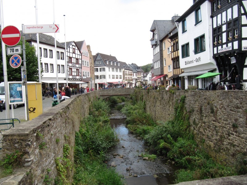 Montag 19.09.2011 - von Heimbach nach Bad Münstereifel Die ganze Nacht hat es geregnet. Aber so gegen 7.00 Uhr früh hört es endlich auf. Heute entfällt die obligatorische Runde mit Dackel Max. Wir haben seit wenigen Tagen ein technisches Problem und wollen so früh wie möglich bei einer FIAT-Werkstatt sein. Die nächste soll laut unserem Verzeichnis in dem Ort Kall sein. Vor Ort stellen wir fest, dass es diese Werkstatt nicht mehr gibt (ein FIAT-Schild ist auch nicht mehr zu sehen). Also auf nach Euskirchen. Da soll noch eine FIAT-Werkstatt sein. Zum Glück brauchen wir auch nicht lange suchen, wir finden sie direkt am Ortsausgang. Unser Problem (die Sicherung F31, von der u.a. die Funktion des Scheibenwischers, Rückfahrkamera u.a. abhängt, brennt immer wieder durch) kann man dort aber nicht beheben, also müssen wir weiterhin diese Sicherung bei Bedarf immer wieder erneuern. Von Euskirchen ein paar Kilometer entfernt erreichen wir gegen Mittag das schöne Städtchen Bad Münstereifel. Hier wollen wir bleiben und finden am Eifelbad ist einen recht schönen Stellplatz. Sofort machen wir uns auf den Weg mit Max, der heute bisher ein wenig zu kurz gekommen ist. Eine gute Stunde gehen wir Wald und Wiesen entlang und Max hat sogar in einem kleinen Bach Gelegenheit zum Baden.