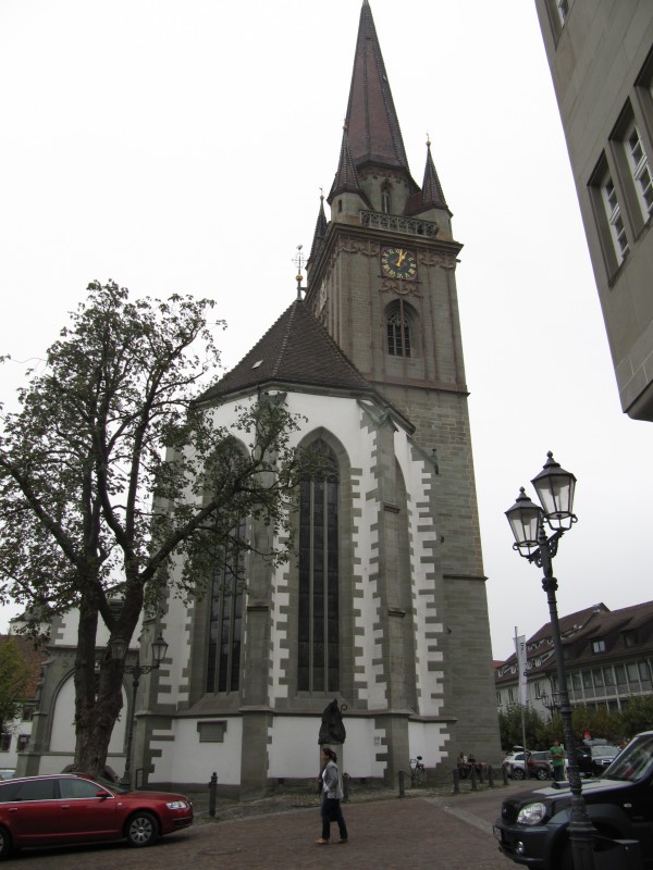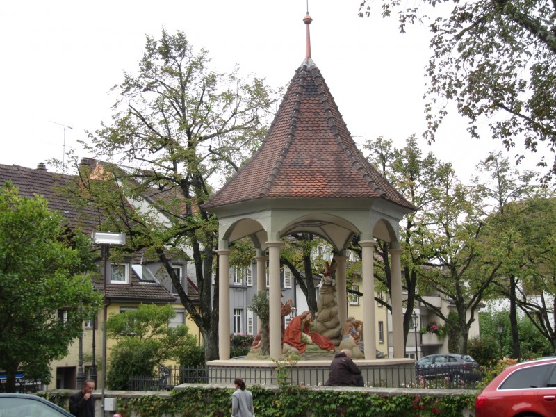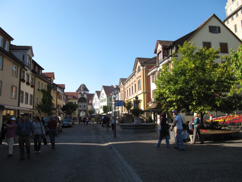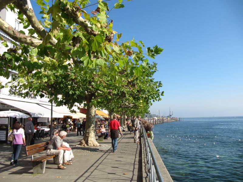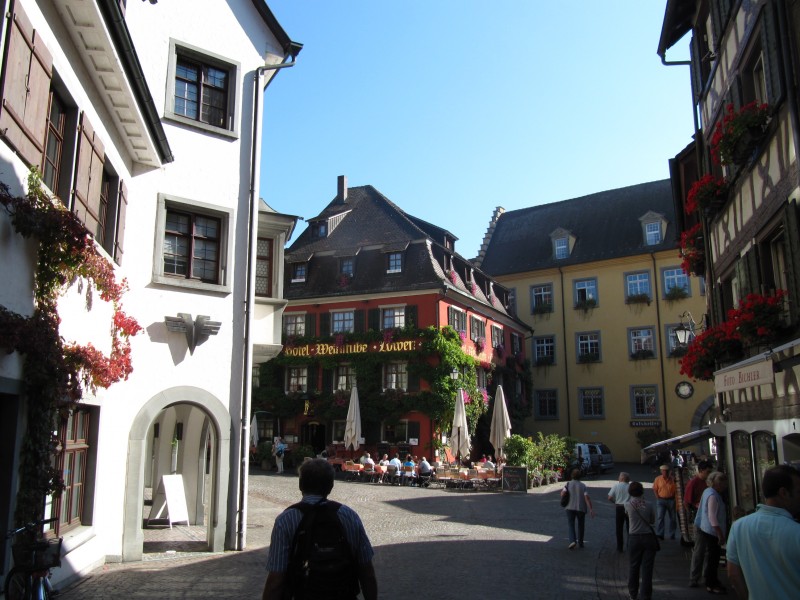 Sonntag 02.10.2011 – in Wahlwies Auch heute beginnt der Tag wieder mit Hochnebel. Wir beschließen mit der stündlich verkehrenden Bahn nach Radolfzell zu fahren und uns die dortige Altstadt anzusehen. Nach einer angemessenen Runde mit Dackel Max durch die Apfelplantagen, machen wir uns auf den Weg zu dem kleinen Bahnhof. Wir sind schon 10 Minuten vor Abfahrt des Zuges dort. Leider ist kein menschliches Wesen für den Verkauf der Fahrkarten zuständig, sondern ein Fahrkartenautomat. Und von diesem wird uns ein Kampf aufgezwungen, den wir zunächst leider verlieren. Während der eine Fahrschein einigermaßen unkompliziert erstellt wird (zwei 2-Eurostücke hinein, Wechselgeld und Fahrtkarte kommen heraus), klappt das selbe bei dem Fahrschein für die zweite Person, trotz Unterstützung durch Einheimische leider nicht (ein zweites 2 Eurostück will der Automat dieses mal nicht mehr annehmen und bitteschön passendes Geld haben). Der Erfolg, der Zug fährt ohne uns ab. Wir sind ganz schön sauer. Also passendes Kleingeld auftreiben. In dem kleinen Dorf Wahlwies, in dem am Sonntag kaum einer auf der Straße ist, nicht einfach. Schließlich klappt es aber und wir können immerhin mit dem nächsten Zug nach Radolfzell abfahren. Mit Radolfzell hatten wir Glück. Eine durchaus sehenswerte Altstadt. Unser Besuch wurde auch dadurch aufgewertet, dass dort verkaufsoffener Sonntag war und an vielen Stellen der Altstadt standen Musiker, Blaskapellen und Bands . Man konnte also gut bummeln.