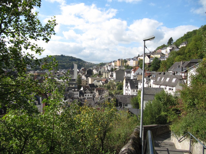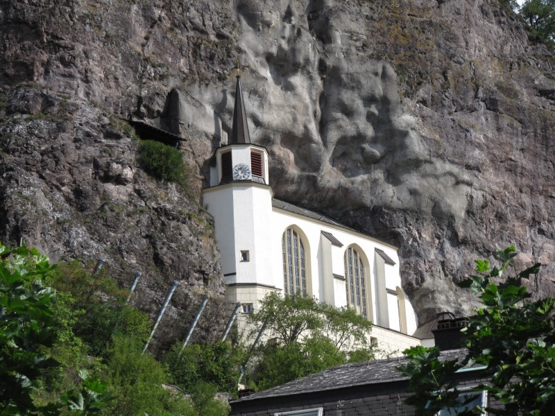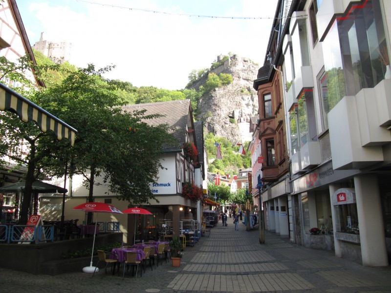 Freitag 23.09.2011 - in Oberbrombach Der Tag beginnt – wie fast immer - mit einer Runde mit Dackel Max. Unser eigentliches Vorhaben für heute ist aber, der Besuch der Stadt Idar-Oberstein. So machen wir uns gegen 11.15 Uhr auf den Weg zur Bushaltestelle in Oberbrombach. Der Bus ist pünktlich und so sind wir schon nach 10 Minuten Fahrt in Idar-Oberstein. Wir bummeln durch die Altstadt und kommen zur Felsenkirche. Diese Kirche ist in einen Felsen hinein gebaut und ist das Wahrzeichen von Idar-Oberstein. Dann geht es bergauf zur Burg Bosselstein (wegen Bauarbeiten leider kein Zutritt) und zum Schloss Oberstein.