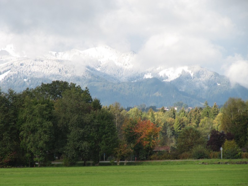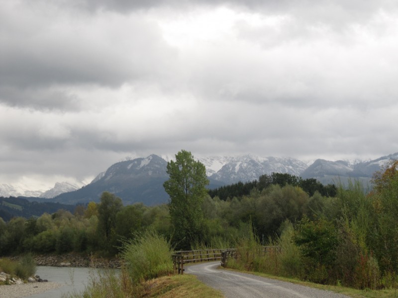 Freitag 07.10.2011 – von Blaichach nach Nesselwang In der Nacht hat es schon geregnet. Früh am Morgen tröpfelt es noch etwas und es ist richtig kalt . Dann hört der Regen aber zunächst auf und wir können mit Pullover und Anorak bekleidet, unsere kleine Wanderung mit Max machen. Wir machen den Rundweg um den in der Nähe des Stellplatzes gelegenen See und gehen ein ganzes Stück am Lech entlang. Die umliegenden Berge sind allesamt weiß.