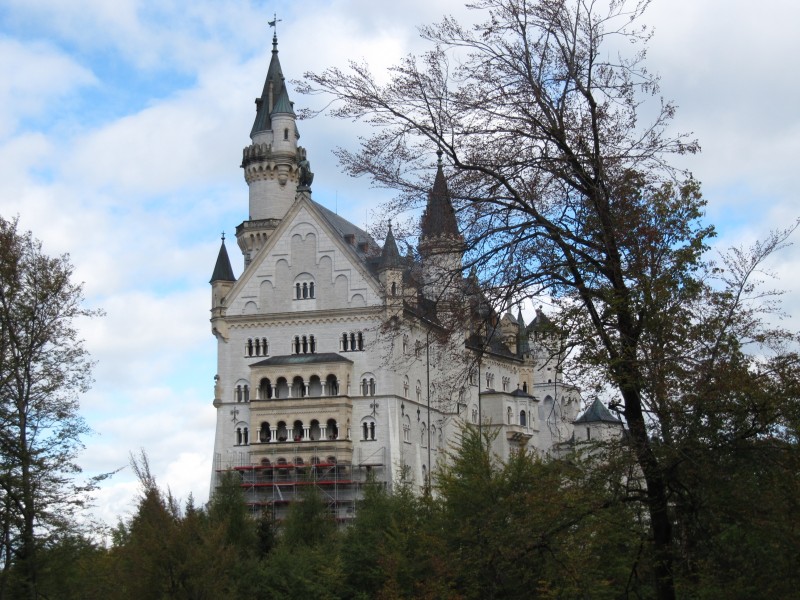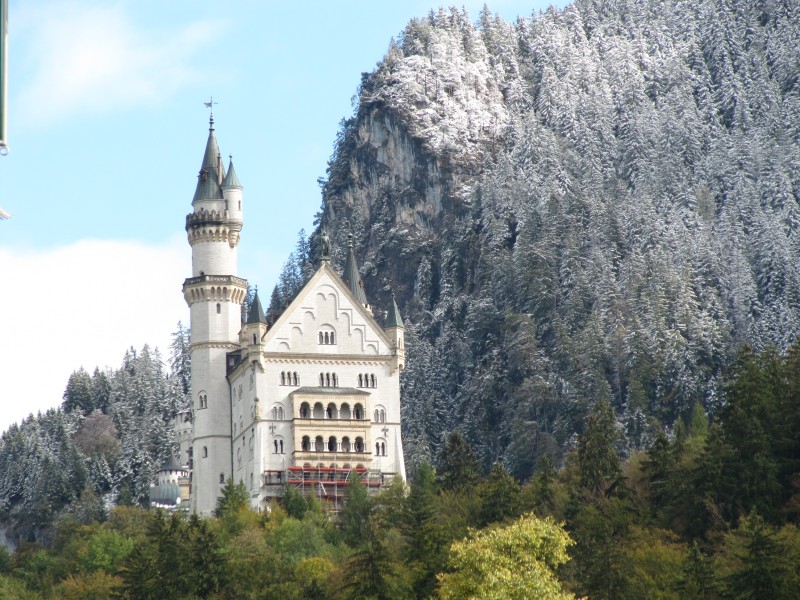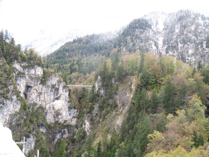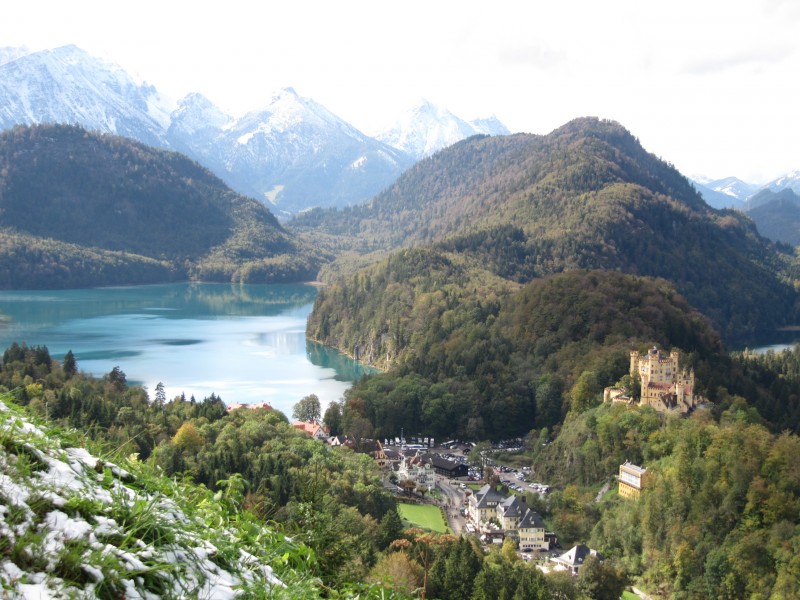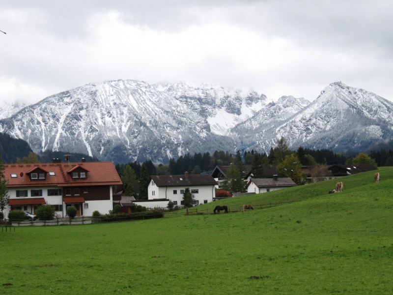 Samstag 08.10.2011 – von Nesselwang nach Füssen Eigentlich wollten wir in Nesselwang bleiben und sogar etwas wandern (mit der Alpspitzbahn hinauf und zu Fuß wieder hinunter). Aber schon in der Nacht hat es stark geregnet und auch am Morgen gießt es unaufhörlich. Sogar der morgendliche Spaziergang fällt dem Regen zum Opfer. Es ist einfach nicht machbar. Max will auch nicht hinaus. Gegenüber gestern ist es noch etwas kälter geworden. Weil ein Ende des Regens nicht abzusehen ist, entschließen wir uns weiterzufahren. Auf jeden Fall wollen wir aber an unserer Absicht das Schloss Neuschwanstein zu besichtigen unbedingt festhalten. Als wir Füssen erreichen, sehen wir den Baumarkt OBI. Eine gute Gelegenheit, die leere Gasflasche, gegen eine volle zu tauschen. Wir steuern also OBI an und siehe da, nebenan befinden sich Wohnmobil-Stellplätze. Spontan entscheiden wir uns in Füssen zu bleiben. Nun hat sogar der Regen aufgehört und wir können den Weg mit Max nachholen, der heute morgen ausgefallen ist. Es ist eine kleine Wanderung auf einem sehr schönen Weg zwischen Wiesen und Feldern, von dem sehr gut die verschneiten Berge und hoch gelegenen Wälder sehen kann . Die Schneegrenze liegt ziemlich tief.