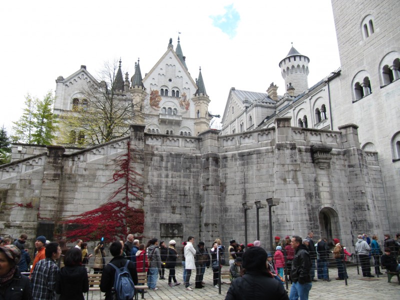 Aber dann, es ist kurz nach 11 Uhr, geht es los zum Schloss Neuschwanstein. Nicht mit dem Wohnmobil, sondern mit dem Linienbus, der vom Bahnhof Füssen abfährt. Also erst einmal 1,5 Kilometer zu Fuß zum Bahnhof. Nach meiner eigenen Uhr und der Bahnhofsuhr, muss der Bus etwa 2 Minuten zu früh abgefahren sein. Jedenfalls waren wir pünktlich dort, aber der Bus war schon weg. Zum Glück fährt der nächste Bus eine halbe Stunde später. Also warten! In Hohenschwangau etwa um 12.30 Uhr angekommen, geht es sofort zum Ticketschalter. Außer uns haben offenbar noch viele andere Menschen die Idee gehabt, heute das Schloss zu besichtigen. Jedenfalls ist die Schlange sehr lang und wir müssen 30 bis 40 Minuten anstehen, um Karten für die Führung um 15.00 Uhr zu ergattern. Wir sehen, dass das Schloss Neuschwanstein ziemlich weit oben liegt. Das alles bergauf laufen ? Wir entscheiden uns mit einer Pferdekutsche zu fahren, die sogar relativ schnell verfügbar ist. Die Kutschfahrt bergauf dauert etwa 20 Minuten. Weil wir uns nicht bewegen, wird uns in der Kutsche saukalt und als wir oben ankommen, sind wir richtig durchgefroren. Laufen wäre doch besser gewesen, dann wäre uns warm. Bis zum Beginn der Führung haben wir noch Zeit. Zeit sich vor dem Schloss umzusehen, auf die Marienbrücke zu gehen (schöne Aussicht auf das Schloss), zu fotografieren und zu filmen, eine Rostbratwurst zu essen und vor allem zu warten.