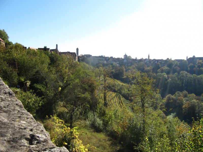 Donnerstag 13.10.2011 – von Nördlingen nach Rothenburg o.T. Nach einem etwas kürzeren Spaziergang als sonst mit Max (nur eine halbe Stunde) und Einkauf bei Kaufland in Nördlingen geht die Fahrt über Dinkelsbühl nach Rothenburg ob der Tauber. Dinkelsbühl hat zwar auch eine sehr sehenswerte Altstadt, aber wir haben uns diese kleine Stadt erst vor zwei Jahren angesehen und daher sind wir heute dort durchgefahren. Es ist Mittagszeit als wir in Rothenburg an kommen. Wir finden einen Platz auf dem Stellplatz P2 an der Nördlinger Straße. Wir gehen nicht sofort in die Altstadt, sondern machen zunächst einen längeren Spaziergang mit Max. Unser Weg führt uns hinunter in das Taubertal, ein Stück der Tauber entlang und dann wieder steil bergauf zurück zum Stellplatz.