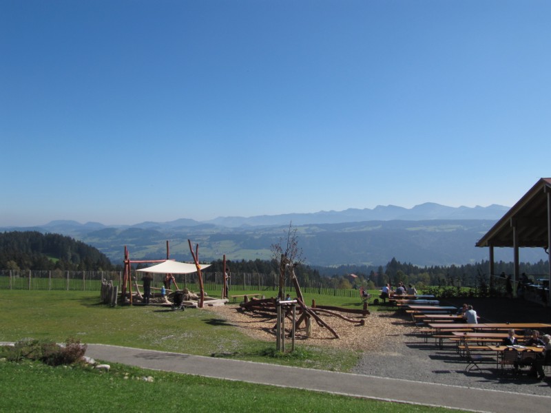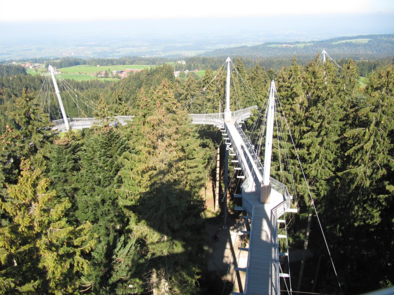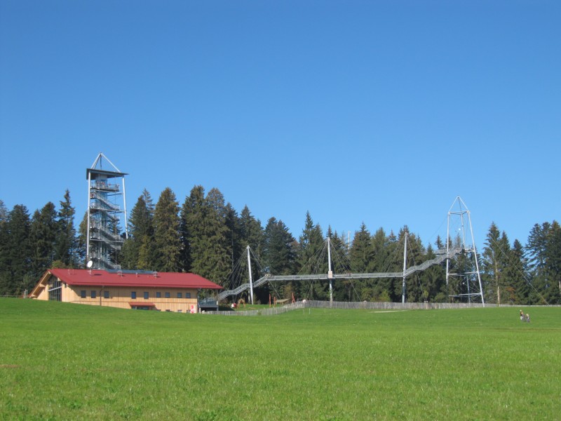 Donnerstag 06.10.2011 – von Scheidegg nach Blaichach Der Tag beginnt wieder mit einer kleinen Wanderung mit Dackel Max. Heute müssen wir uns aber etwas anstrengen. Der Weg geht stark bergauf. Während wir unsere Mühe haben, hat Max noch Kraft für kleine Exkursionen auf die am Weg liegenden Wiesen und tobt sich dabei richtig aus. Dann fahren wir mit dem Wohnmobil hinauf nach Obergschwend. Dort befindet sich in etwa 1000 Meter Höhe den Skywalk (Baumwipfelpfad). Hier läuft man in Baumwipfelhöhe und hat eine herrliche Aussicht auf die umliegenden Berge des West-Allgäus. Leider ist es etwas diesig, so dass wir eine richtige Fernsicht nicht haben.