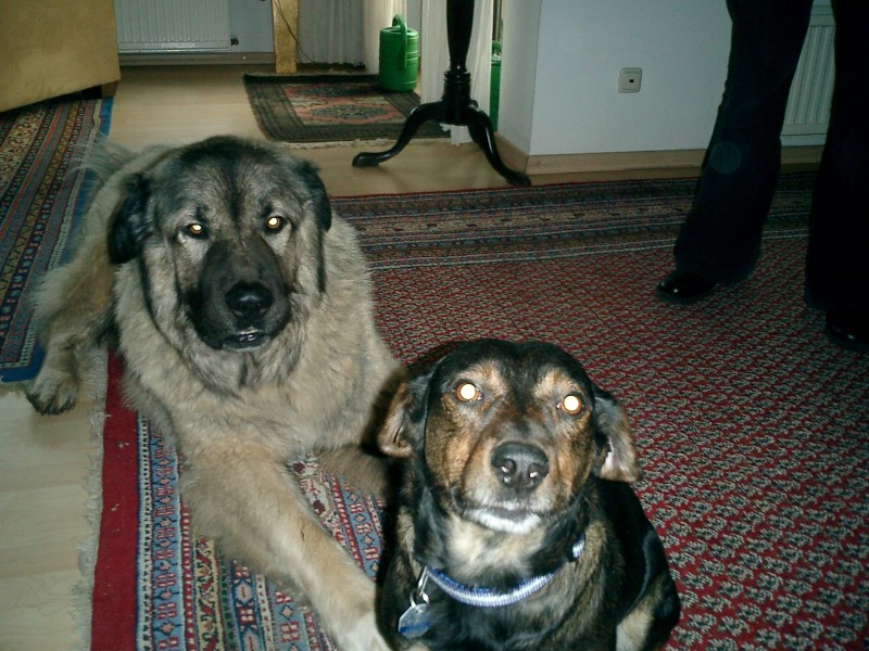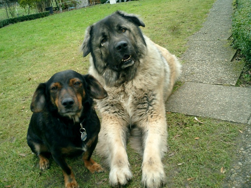 Im Jahre 2000 kam ich auf einer Dienstreise in ein kleines thüringisches Dorf. Auf einem großen Platz war ein ca. 5 – 6 Monate junger Hund an einer ca. 4 m langen schweren Kette angebunden. Die Kette war schon leicht am Hals eingewachsen. Keine Hütte, alles eingekotet. Da wir seit 30 Jahren Leonberger in unserem großen Haushalt hatten, nahm ich auf Grund einer leichten Ähnlichkeit an, dass es sich um einen Leo -Mischling handeln würde. Nachfragen bei Nachbarn etc. ergaben, dass sich der Hundebesitzer wohl überfordert gefühlt habe. Beschwerden beim Veterinäramt / Tierschutz etc waren erfolglos ( in den neuen Bundesländern war Kettenhaltung wohl erlaubt gewesen, sodass hier ein anderes Bewußtsein auch bei der zuständigen Behörde vorhanden war. Kurzum, nach 3 Monaten schafften wir es, den Hund abzukaufen. Dieser Hund hatte überhaupt keine irgendwie geartete Sozialisation genossen. Er rannte wild über das gesamte Grundstück, kannte keine Glasscheiben/ Terassentüren, keine Personen/Kinder , kein Auto nichts. Obwohl wir etwas Erfahrung mit Großhunden hatten, versuchten wir über den Zuchtverband (wir bekamen beim Kauf Original-Papiere) hilfreiche Informationen zu erhalten. Fehlanzeige; nur Warnungen und Schauermärchen über Agressivität etc. Wir fanden einen mutigen Hundetrainer ( in Göttingen).Keine Dressur, nur familiäre Sozialisation, 12 m Bergsteigerseil als Laufleine (die er einmal beim Anblick einer Katze zerriss, obwohl ich mir die Leine um den Körper geschlungen hatte und selbst ca. 100 kg Kampfgewicht auf die Waage brachte). Unterordungsübung wurde ein regelrechter Ringkampf auf der Wiese ( völlig ohne Beißen); Nach 6 Wochen konnte er im Kombi mitfahren, Hundeführeschein mit anderen Hunden , mit Stadtgang , und dem Besuch der Geschirrabteilung eines Kaufhauses wurde erfolgreich absolviert. Ebenso die damals erforderliche Prüfung wegen Einstufung als Kampfhund II.Kategorie : mit Fremdhundprovokation durch Polizeihund, Regenschirm, Kindergeschrei, Einkaufswagen, Feuer etc. : alles erfolgreich. Dieser Hund wurde als reiner Familienhund gehalten und geführt: jeder konnte mit ihm Gassi gehen, selbst Opa mit 80 Jahren. Unsere Tochter nahm ihn mit auf kleine Reitturniere, wo er frei umherlief und lediglich durch Lautsprecherdurchsage aufgefordert wurde den Abreiteplatz zu verlassen ( V. möge doch das langhaarige Pony _ er hatte mittlerweile 80 cm Risthöhe und wog 68 – 70 kg)- abholen; die Würstchenbuden kannte er auch recht schnell). Unser Sohn nahm ihn mit auf den dörflichen Sportplatz. Fazit:: Schutzhundmäßige Dressur ging gar nicht; normale Befehle ( Sitz, Platz ,Bleib Komm) gingen so halbwegs, Verträglichkeit mit anderen Hunden war sehr gut;bester Spielkamerad war ein Tierheimmischling, was uns dann veranlaßte auch einen Dackelmischling aus dem Tierheim zu uns zu nehmen.Auch die Westies , die sich in sein Brustfell hängten und sich von ihm tragen ließen. Beim Gassi gehen war viel freies Feld nötig, aber absolut kein Wildern; Grundstück wurde durch Bellen bewacht, er ließ aber jeden rein, sogar den Postboten. Sogar, als unser Neffe nach dreijähriger Abwesenheit uns besuchte und plötzlich mit unserem „Yogi“ im Wohnzimmer stand ( er wußte nichts von unserer Neuerwerbung und glaubte einen „Leo“ vor sich zu haben), gab es keine Probleme. Gleichwohl war es kein einfacher Hund , der schon sehr viel Eigenständigkei besaß, und ist wohl auch nichts für unerfahrene Hände. Für uns war es aber wieder die Bestätigung, dass wohl eine familienbezogene Haltung ( hier im Hause und ohne Zwinger) , ohne jegliche Scharfmacherei, eine positive Rolle spielt. Selten hat uns ein Hund soviel Bereicherung und Freude vermittelt. Im Herbst 2010 verstarb er an Herzschwäche. Alles Gute zum neuen Jahr von Olli aus GÖ P.S. Ich übe noch, Bilder einzustellen. ![]() Owtscharka und Dackel-Mix ![]() Ich werde auch noch groß und stark