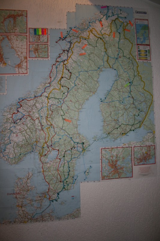 Zur ständigen Inspiration habe ich zu Ostern über zwei Stunden auf dem harten Parkett gekniet und unsere bisherigen Reisen in Skandinavien anhand unseres Übernachtungsbuches auf einer riesigen Karte eingetragen. Zuhilfe nehmen musste ich natürlich die genaueren Regionalkarten der einzelnen Länder, die wir angeschafft haben, sonst hätte ich nicht mehr alles auf der groben Karte gefunden. Dazu natürlich die Fahrstrecken. Ich kann mir das gut merken, Landkartenlesen ist meine Leidenschaft. Obwohl das Klischee sagt, dass Frauen zu doof zum Kartenlesen sind. Ich will aber immer wissen, wo ich bin, das Tomtom mit guter Software für die genauen Koordinaten haben wir allerdings auch. Die Kinder wundern sich immer, wenn ich genau weiß, wo welches Bild geknipst wurde. Aufgehängt haben wir die Karte an der Treppe zum Keller, neben der Wohnzimmertür. Also fällt immer der Blick drauf. Eingetragen habe ich unsere Womofahrten von 2008, 2009 und 2011 jeweils in rot, grün und blau. Die Übernachtungsstellen habe ich "gekringelt". Unsere Erstlingsfahrt umfasste auch an die 13000km, allerdings war die 2007 im gemieteten Womo, und das berechtigt nicht zur Dokumentation. Außerdem haben wir da noch nicht Buch geführt, wir wissen nur die Route, nicht mehr die genauen Stellplätze.