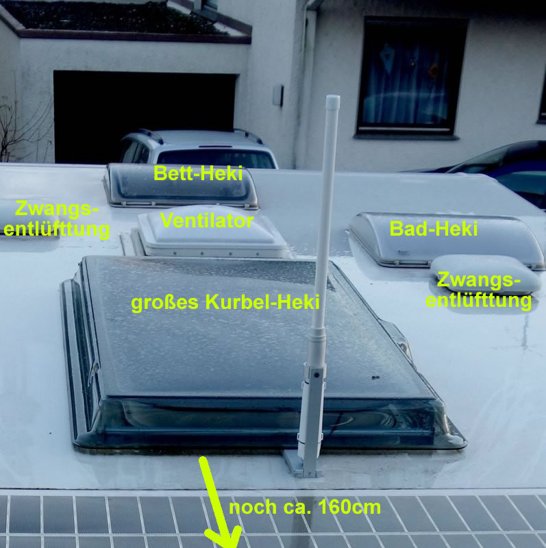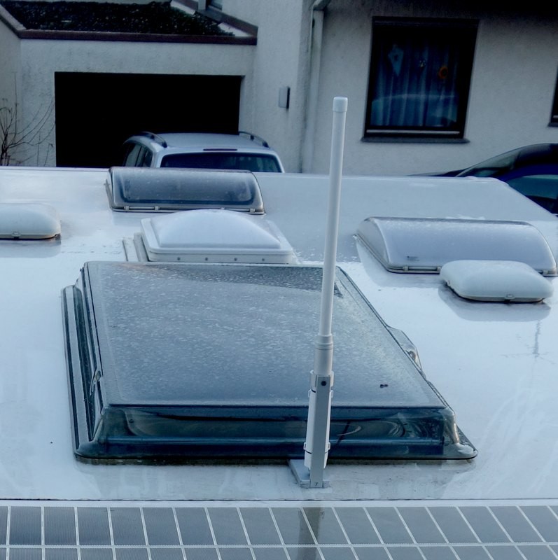 Und hier kommt der Fluch des Aluaufbaus. Für einen bestmöglichen Empfang müssen diese Antennen eben frei zum Himmel liegen. Vorne an der Panoramascheibe ginge sicher auch, aber oben auf dem Dach wäre es natürlich noch besser. Wer einen GFK-Aufbau hat, hat diese Probleme nicht. Er klebt die Antennen einfach irgendwo innen auf die Außenhaut. Naja, dafür brauche ich keine Blitzeinschläge befürchten :? blöder Trost.
