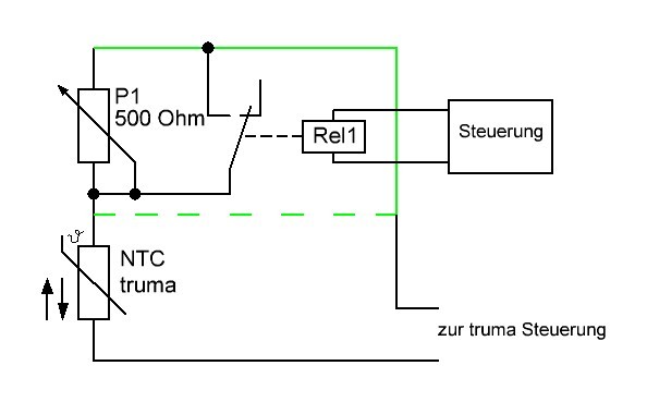 So und nun zur Schaltung: Im Bild hat das Relais angezogen (liegt unter Spannung), weil es z.B. durch meinen Tracker eingeschaltet wurde. der Gesamtwiderstand beträgt nun NTC + 500Ohm. Steht die Heizung auf 15 Grad meint die truma es wären nur 8 Grad. Sie heizt also auf 22 tatsächliche Grad und meint dann, das es 15 Grad sind und schaltet ab. Schaltet man das Relais aus, wird der Regelwiderstand überbrückt und es ist alles wieder 100% truma und die truma schaltet bei echten 15 Grad. Am Poti kann man die Zuheizung in Grad einmalig eintrimmen oder via Skala einstellbar machen. Das gestrichelte grüne Kabel ist es, welches vom NTC abgenommen und anders verdrahtet wurde.