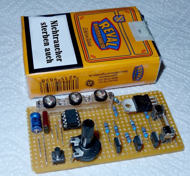 Besonders tricksy: Ich habe auf den Taster verzichtet. Die Programme kann man über den Poti einstellen. Ein Anschlag ganz nach rechts und er spielt alle Programme jeweils 5 Sekunden durch. Ist das gewünschte Programm dabei, dann einfach zurückdrehen und Helligkeit einstellen. Mit dem Einschalten kommt automatisch immer die TV-Simulation. Theoretisch könnten die LED 9W, ich betreibe sie jedoch nur mit max. 5Watt, da dies schon sauhell ist. Man kann die Box auch locker als Lese- oder Fernsehlicht verwenden. Oder das Romatiklicht für schöne Stunden....... Und wieder ist ein Projekt fertig. :ja: