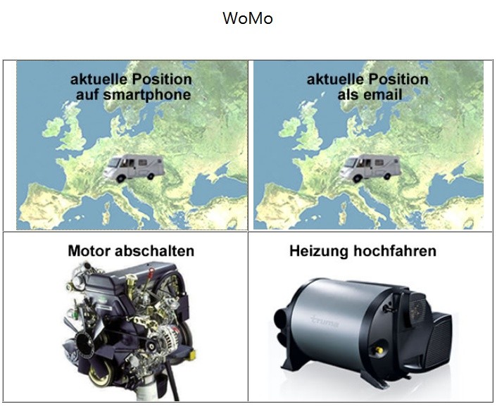 Folgendes funktioniert schon: GPS-Ortung: Basis für die GSM/GPS Kommunikation ist ein KT310 Link zum eBay Artikel Ich kann mittels normalem Handy (nur GSM) die aktuelle Position des WoMo ermitteln, ein Signal zur Motorabschaltung senden (wenn <10km/h wird abgeschaltet), ein Signal für die truma senden und auf Wunschtemperatur zu gehen. Mittels smartphone oder PC geht es auch von jedem Ort der Welt (natürlich speziell abgesichert, dass nur ich reinkomme) Der Prototyp der Oberfläche sieht so aus, wird aber noch schicker werden: Ein Klick auf die gewünschte Funktion und die Aktion wird eingeleitet. Vom Webserver aus wird die Aktion wiederholt, falls das GSM/GPS-Teil nicht innerhalb 1 Minute antwortet. Dies ist wichtig, weil SMS nicht als 100% gesicherter Versand definiert ist. Mit dem smartphone ist es natürlich richtig chic, weil man die Position sofort in google-maps sehen kann. Motorabschaltung und truma-Koppelung steht noch aus, ist aber nur Fleißarbeit. Hat man gar keinen Empfang, kann man auch eine Ortung via email anfordern und erhält als email einen google-Link mit der aktuellen Position zurück. Hierzu muss man allerdings etwas mit php oder perl umgehen können.