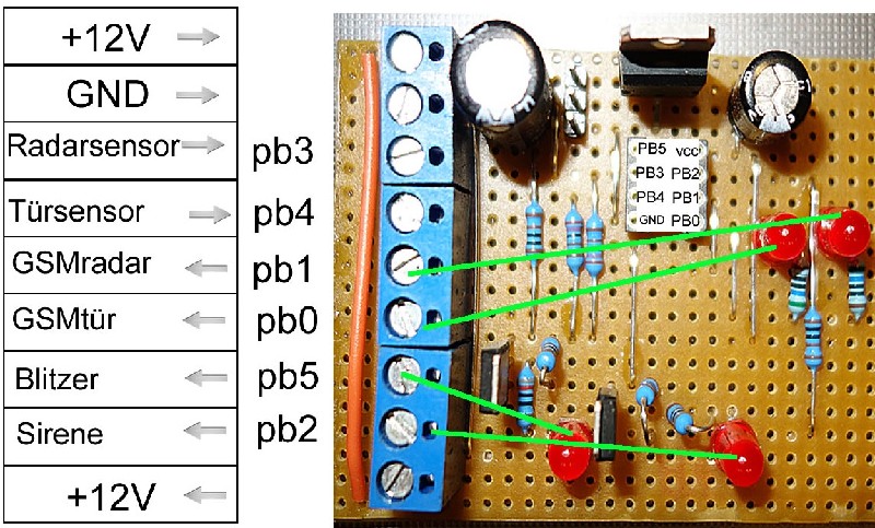 Auch könnte man Alarmsensoren direkt am KT310 anschließen, wie z.B. Türkontakte, IR-Sensoren, etc. aber ich werde es anders machen. Denn ich will nicht, dass ich alle Minute eine sms bekomme, wenn die das im WoMo rumbtoben. zudem will ich ja auch noch ein paar "Spezialitäten" verbauen. Deshalb wird das KT310 in meinem Fall von einem kleinen MP angesteuert, welches die Alarmkontrolle und die "Disziplinierungsmaßnahmen" :lach: übernimmt.