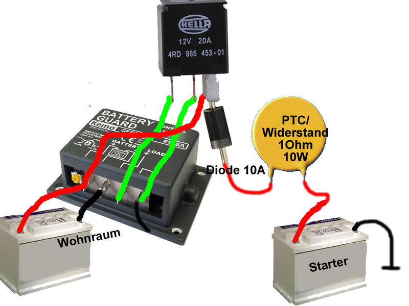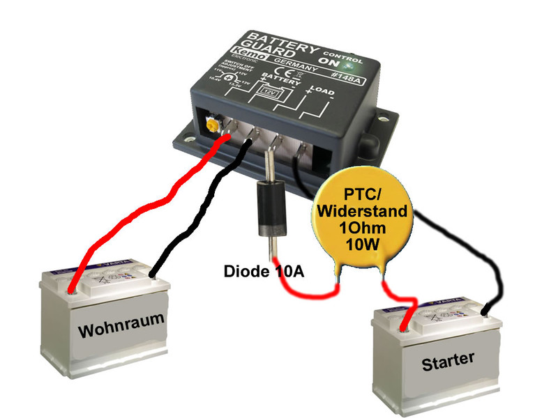 Leider nun doch eher :flop: Wie ich nach in der Suche finden konnte, schaltet dieser Baustein über die Minusleitung. Somit ist sie vermutlich in genannter Beschaltung für uns unbrauchbar. Es müsste noch in kleines Relais dazu verschaltet werden, was aber auch kein Problem ist. ![]() Wie geschrieben eben noch ohne Garantie, weil ich es noch nicht aufgebaut und getestet habe. Hey raidy, Wozu dann eigentlich noch der unterspannunskasten? Warum nicht beide Batterien mit einem 2,5* Kabel verbinden mit deiner Diode und wiedererstand... Eine Sicherung wäre noch hilfreich dazwischen!