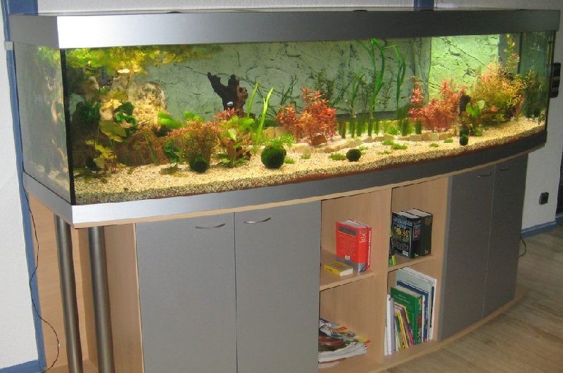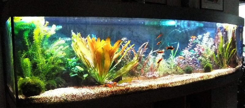 Das Aquarium ist 250cm lang, 70cm hoch und hat eine gewölbte Scheibe. Außen ist es 60cm tief, in der Mitte 80cm. Die Glasstärke beträgt 10mm.