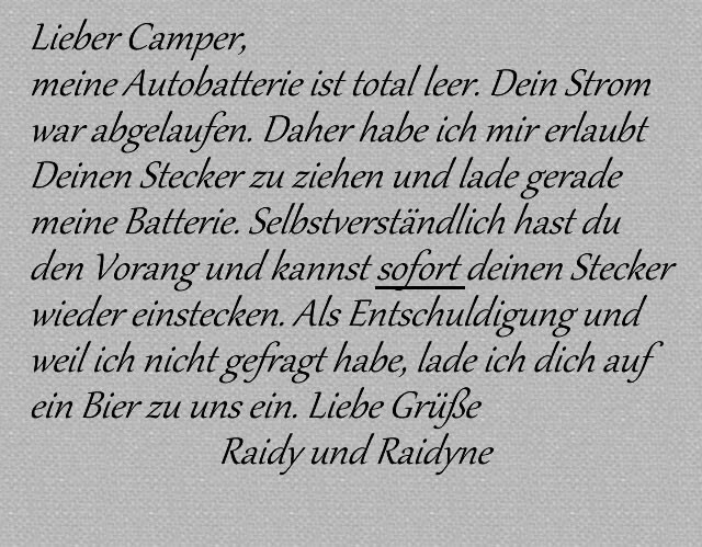 Ich habe einen Stromanschluss belegt und habe ein Guthaben von ca. 1 Euro aufgeladen. Dann gehe ich ins Städtchen oder sonstwo hin. Bummeln, Essen etc. Kühli läuft auf Strom......es ist heiß ohne Ende. Später komme ich zurück zum Platz - Mein Stecker ist draußen, ein fremder Stecker eingesteckt, Guthaben 50 Cent..............meine Lebensmittel schön handwarm.......... 2 Möglichkeiten: 1. Mein Guthaben war tatsächlich alle, aber soviel Energie benötigen meine Geräte nicht. Wieso sollte ich das glauben.........egal ob Zettel oder nicht. 2. Der Typ ist ein Stromdieb, der es darauf angelegt hat, Anderen den Strom zu klauen....... In Jedem Fall gäbe es Ärger. Habe es unbeteiligt, da stromlos in Aschaffenburg im letzten Jahr erleben dürfen. Da hatte wohl einer auch einfach mal so gezogen......... ICH würde niemals einen fremden Stecker ohne Rücksprache anfassen. Wenn wir im Winter unterwegs sind und auf dem Stellplatz nicht genügend Stromsäulen zur Verügung stehen. Haben wir bisher immer nette Leute auf dem Stellplatz getroffen die mit uns den Strom teilen. Man muss halt nur früh genung fragen. Ein Notfall wie des öfteren hier beschrieben tritt ja nicht von jetzt auf gleich ein.