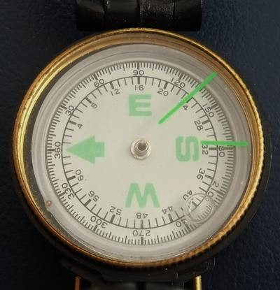 4) Mit Kompass den Süden suchen und die Südnadel mit der Skala auf 180° bringen.