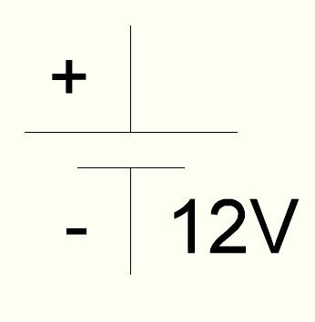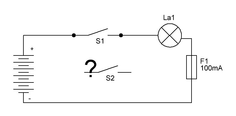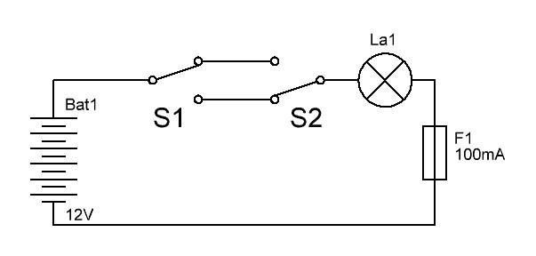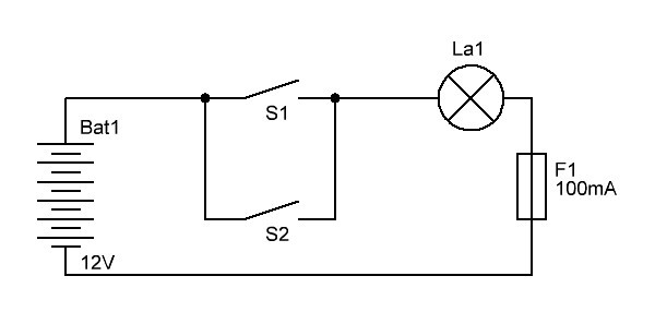 Links deine Autobatterie, dann oben einen Taster ("Klingelknopf"), dann eine Lampe, eine Sicherung und wieder der Rückweg zur Batterie.