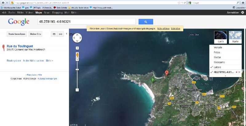 Wenn ihr auch mal frei stehen wollt: 48.278195,-4.616321 Koordinaten bei gugel-maps eingeben.