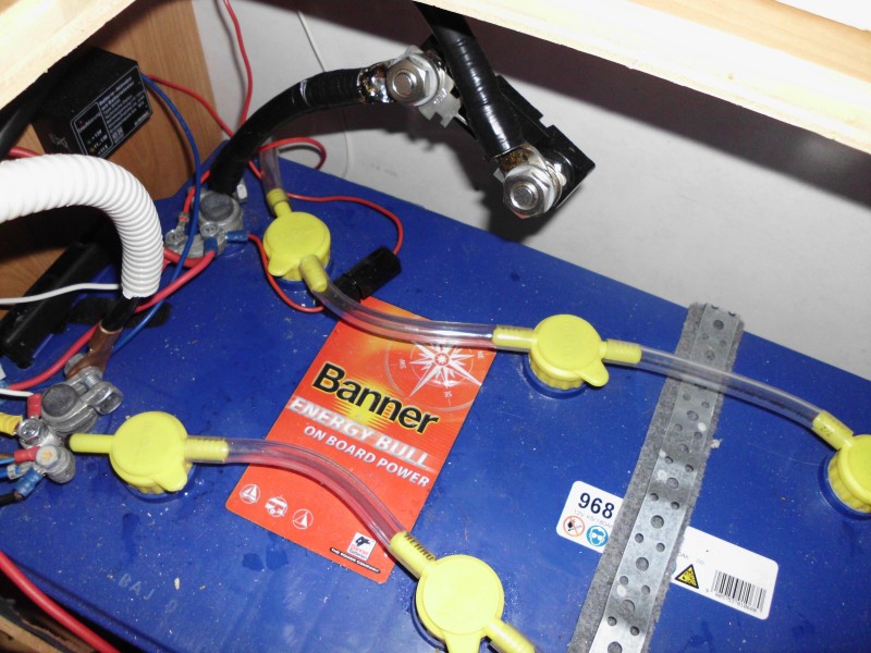 Verspätet hier nun ein paar Fotos aus der "Einbauphase". Nach meinen Erfahrungen wichtig sind: 1. Sicherung direkt an der Batterie. 2. Freihängend mit direktem Zugriff. 3. dicke Kabel (hier 20 cm kurz bei 54 qmm Durchmesser. 4. ordentliche Batteriekapazität, sonst gehen im Winter schnell die Lichter aus.