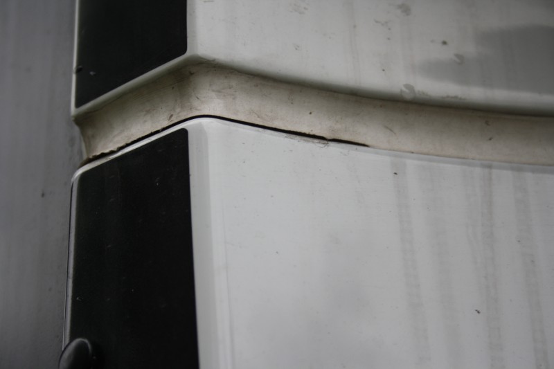 Hallo Günther! Hier noch einmal ein Bild der Kunststofffender. Die Dichtmasse reißt nicht nur im Bereich des Roten Pfeiles. Auch die senkrechten Fugen setzen sich schon nach kurzer Zeit ab. mfG.vadderho In einem anderen Thread habe ich von meinen Beobachtungen gestern in Sulzemoos berichtet. An allen dort stehenden Teilintegrierten der Marke Carado und Sunlight habe ich Schwundrisse gesehen, und zwar an den waagrechten und senkrechten Fugen. Es sieht so aus, als hätte sich die verwendete Dichtmasse nicht mit dem darunter befindenden Material verbunden. Wenn ihr hier schreibt, diese Schwundrisse könnten später zu Undichtigkeiten führen, wäre dies für mich ein Auschlussgrund für diese Marken. Vadderho, leider hilft dir das nicht weiter. Für mich war dein Beitrag aber sehr hilfreich.