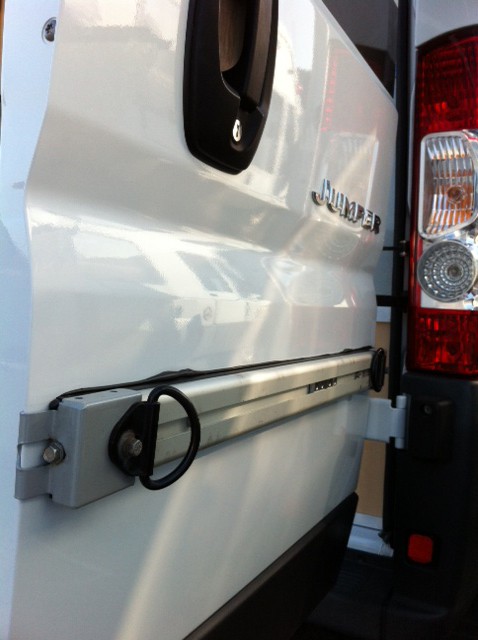 Ich habe an jeder Heck-Flügeltür je zwei Querträger für Fahrradträger befestigt. An diese Querträger habe ich pro Tür je eine 3-mm-Aluplatte befestigt (oben und unten mit den Schrauben des Fahrradträgers angeschraubt). Unten bilden beide Aluplatten eine U-Form, auf der die Bretter und Gabeln stehen.