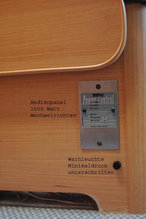 Ich habe eine Einkreis-Luftfederanlage von Goldschmitt, allerdings selbst verbaut. Für meinen Sprinter gibt es wahlweise Einzel- und Doppel-Kegelbalg-Anlagen. Ich hab mich auch hier für die Einzel-Anlage entschieden. Für diese Anlage, die keine ABE hat war die Einzelprüfung durch den TÜV(o.ä.) notwendig, für mich nicht verständlich, da mein Fahrzeug auch ohne die Luftfederanlage schon auf 3,8 t zGG aufgelastet ausgeliefert wurde. In den Begleitpapieren von Goldschmitt ( Typprüfung? ) stand unmissverständlich Mindestdruck 2,0 bar, da bei niedriegerem Luftdruck der Kegelbalg beschädigt werden kann. Ich hab in den letzten 24 Monaten als optimale Druckeinstellung für unser Lade- und Fahrverhalten den Wert von 3,8 bar ermittelt. Darunter will ich nicht, weil dann das Womo "wie ohne Luftfeder" :D zu fahren ist, bei höherem Druck hat man/ich dann das Gefühl, als wäre die Starrachse hinten tatsächlich ungefedert. Aber wahrscheinlich gibt es bei den Federbälgen für den Ducato da andere Vorgaben. Meine Anlage hat bisher noch keinen Luft-Verlust, vielleicht hab ich zu sorgfältig gearbeitet. Wenn ich Veränderungen im Drucksystem haben will, muss ich entweder Luft ablassen oder mit dem Kompressor nachhelfen. Wichtig war für mich die Warnfunktion, die beim Regelventil einstellbar ist. Über eine Verstellmöglichkeit kann ich mir den Einschaltpunkt einer Warn-LED einstellen, die bei Unterschreitung des von mir vorgegeben Mindestdruck dann als Signal aufleuchtet. Diese LED hab ich in die Sitzbank eingebaut, sodaß ich sie bei Einstig in den Aufbau direkt im Auge habe. ![]() Habe leider kein Bild zur Hand, aber bei mir sind einfach direkt am Fahrersitz links unten zwei Manometer mit Autoventil für Lufteinlass-/auslass werksseitig montiert.