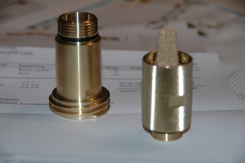 Nochmal den Karton inspiziert: ist ein Karton von der Secumotion!:D :D Also zum Tankfilter: wie von mueckenstuermer schon als Bild hier eingestellt, handelt es sich um ein Messinggehäuse. Die ist zweiteilig, im gerändelten Teil des Filtergehäuses ist innen eine Sintermetall-Einheit eingeschraubt. Diese kann, Origaltext Wynen:"Filtert Aerolse, Öle und Festkörper aus. Kann auch mit Benzin oder Nitro-Verdünner ausgewaschen werden." Also hat man die Wahl, einmalig 79€ + 4,90 Versand für die Tankfiltereinheit zu zahlen, ab und an eine Sichtkontrolle durchführen und Reinigen, oder für 11,90 € eine zweite Filterpatrone dazu kaufen. Ich hab mich für die "Billigversion" entschieden. Wenn ich getankt habe und bei einer Kontrolle erkenne, dass die Einheit beginnt zu verstopfen, wird sie mit Inbusschlüssel aus dem Gehäuse gelöst und gereinigt. Das sollte genügen. Ich hab mal drei Bilder des Tankfilters zur Information über das Innenleben gemacht: