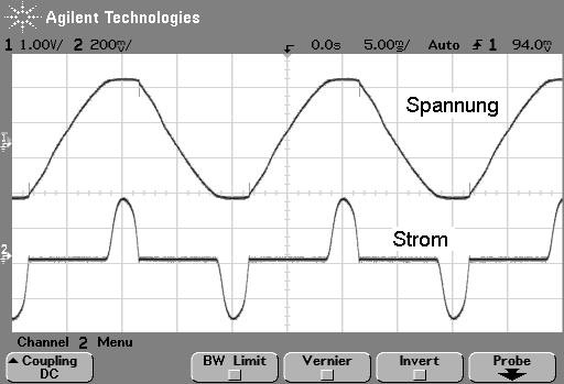 Eigenschaft beider Ladegerätetechnologien ist, dass nur während des kurzen Zeitabschnittes des Spannungsmaximums der 50Hz-Sinuswelle ein kräftiger Stromstoss gezogen wird.