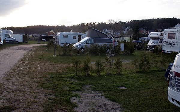 Die Zufahrt zum Platz ist ausgeschildert, die Zufahrt empfanden wir als problemlos. Da der Platz nicht in "erster" Reihe an der Strasse liegt, kann man jedoch schon erst einmal dran vorbei fahren. Die Stellplätze sind ausreichend groß (ca. 80 qm), so dass man genug Platz für Markise und Campingstühle hat. Die Stellplätze sind mit kleinen Hecken abgegrenzt. Die Stromanschlüsse liegen zentral, Wasser kann nahe der Plätze gezapft werden. Jedoch war der Untergrund unseres Stellplatzes, auch der eines MitWomobilisten, sehr uneben, so dass das ausrichten länger dauerte, da wir das WoMo nochmals umsetzen mussten. Die Abfallentsorgung ist vorbildlich geregelt. Die Sanitärräume sind einfach, aber sauber. Die Entsorgungsstation ist aus unserer Sicht vorbildlich. Hunde und Kinder sind willkommen. Die Stellplatzgebühr ist für Usedom akzeptabel, aber einige Leistungen sind gesondert zu vergüten. Die Preise 2012 sind wie folgt (Neben-/Hauptsaison): Stellplatz 1 Fahrzeug mit 2 Personen: 10,50/13,00 EUR je weitere Person: 3,50/3,50 EUR Kinder bis 14 Jahre: 1,50/1,50 EUR Extras: Strom: 2,00 EUR Duschmünze: 1,00 EUR Waschmaschine: 3,00 EUR Trockner: 2,00 EUR Geschirrspüler: 2,00 EUR Münze für Bügeleisen: 1,00 EUR Kurabgabe sind zusätzlich zu entrichten. Die direkte Umgebung ist etwas trist, dafür kann man mit einem gemütlichen Spaziergang in 10 - 15 Min. den Strand erreichen. Für Hundebeseitzer wichtig, dass auf dem Strand Hundeverbot herrscht, der nächste Hundestrand ca. 2,8 km entfernt ist. Ebenfalls kann man in nicht mal 5 - 10 Minuten einen Discounter zum Einkauf fußläufig erreichen. Warum sehen wir den Platz als nur bedingt empfehlenswert an: Es sind letztlich drei für uns wesentliche Gründe, warum wir den Platz nur bedingt empfehlen, wobei es unsere persönlichen Erfahrungen sind, die jeder für sich bewerten möchte: Der unebene Untergrund und das triste Gelände Hunde sind zwar willkommen, Hundetüten sind auch am Platz vorhanden, aber fast überall stehen Schilder herum, dass Hunde ihr Geschäft nicht machen dürfen. Wir räumen die Hinterlassenschaften unseres Hundes immer weg, aber diese Beschilderung erschien uns dann doch etwas befremdlich. Ein absolutes NoGo ist für uns die Situation, dass unser 8-jähriger Sohn die Grauwasserentsorung sehr spannend fand. Unabhängig davon, dass es kein Spielzeug ist sehen wir es als absolut unnötig an, dass er vom Platzinhaber in einer sehr rüden und lauten Art gemaßregelt wird, das geht auch anders. Blick auf den Stellplatz: