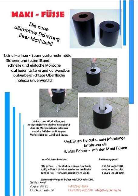 Das ist Spass? Oder? :roll: na, ich weiß nicht...20kg mitschleppen? :eek: Da kannste ja gleich die Markisenfüße in einen Eimer Zement betonieren. :D