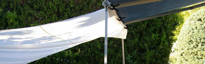 Wenn das Wetter zweifelhaft ist, wird halt abgespannt; geht auch schnell und hat bei uns noch überall gehalten, inklusive Härtetest an der Nordsee, wo's ja schon mal kräftig bläst. Coole Idee, aber jede Wette, jetzt kommen die posts mit.....oha 20 kg zusätzlich :o))))