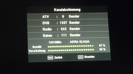 Der Scan hat 1 Stunde und 15 Minuten gedauert und hat 1357 TV Kanäle, 543 Radio Kanäle und 111 Datenkanäle geliefert.