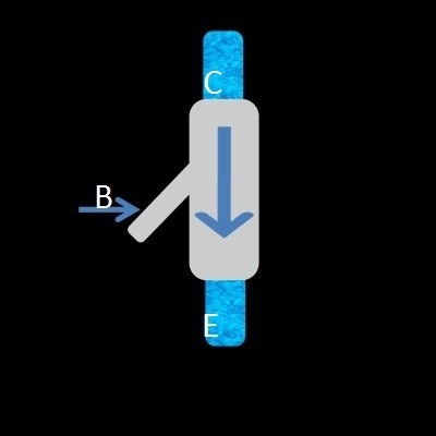 Mit einem kleinen Steuerstrom auf den Hebel (B), erreicht man einen hohen Laststrom auf der Strecke (C->E).