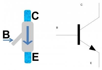 Durch Veränderung des Steuerstromes auf B verändert sich der Laststrom, der durch C->E fließt.